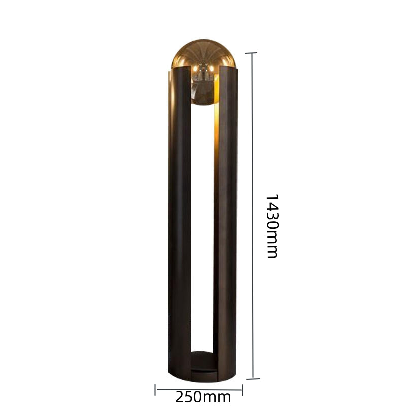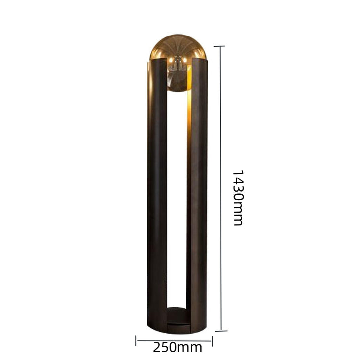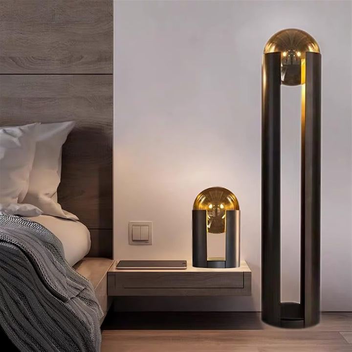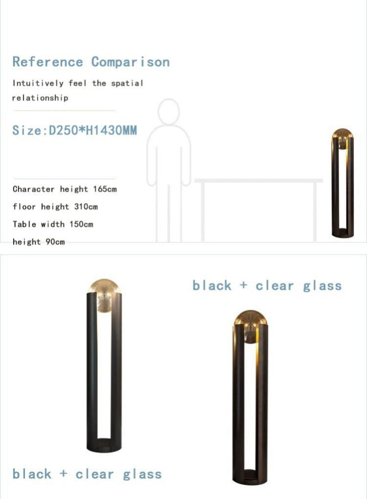 This design showcases a sleek and modern aesthetic, with an industrial, minimalist touch. Its cylindrical structure is crafted from matte-finished iron, standing tall and encompassing a hollow body. Two vertical sections extend upward, creating an open space in the center. Enclosed within this space is a clear frosted glass dome, allowing a soft and warm glow to emanate from the light source within. Not only does this design provide illumination, but it also serves as a contemporary work of art.