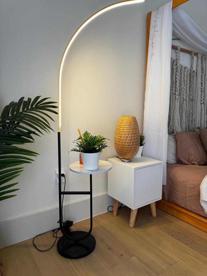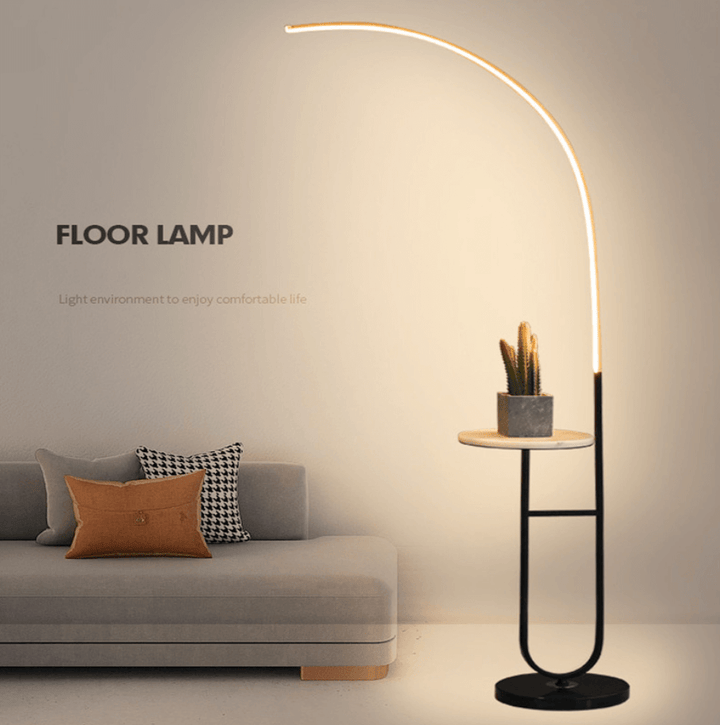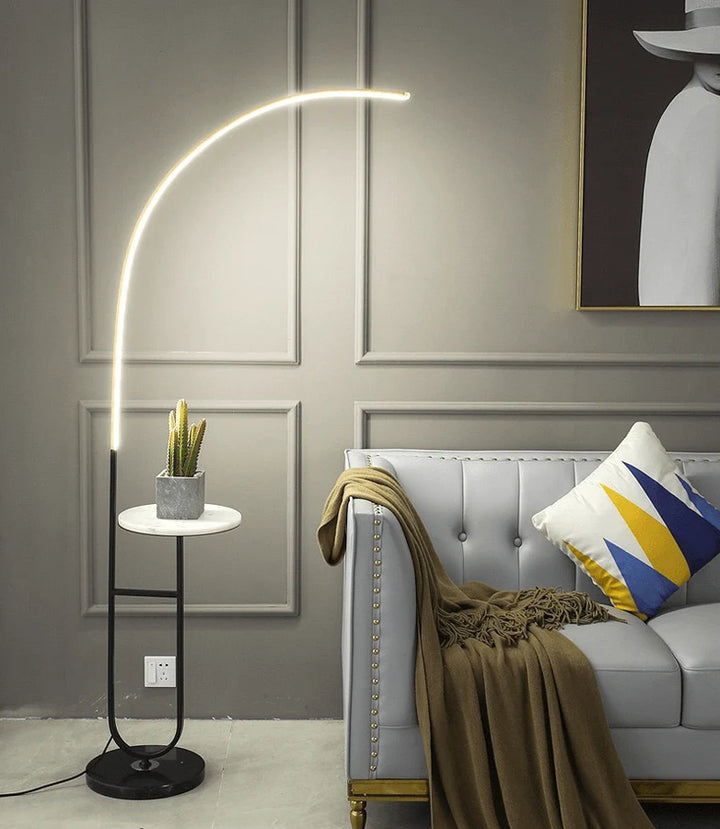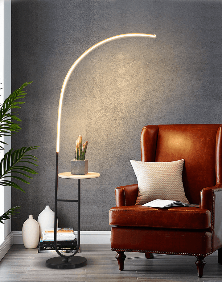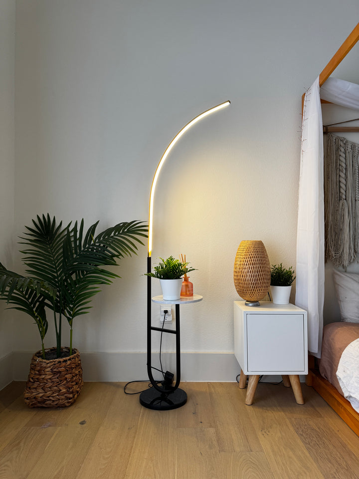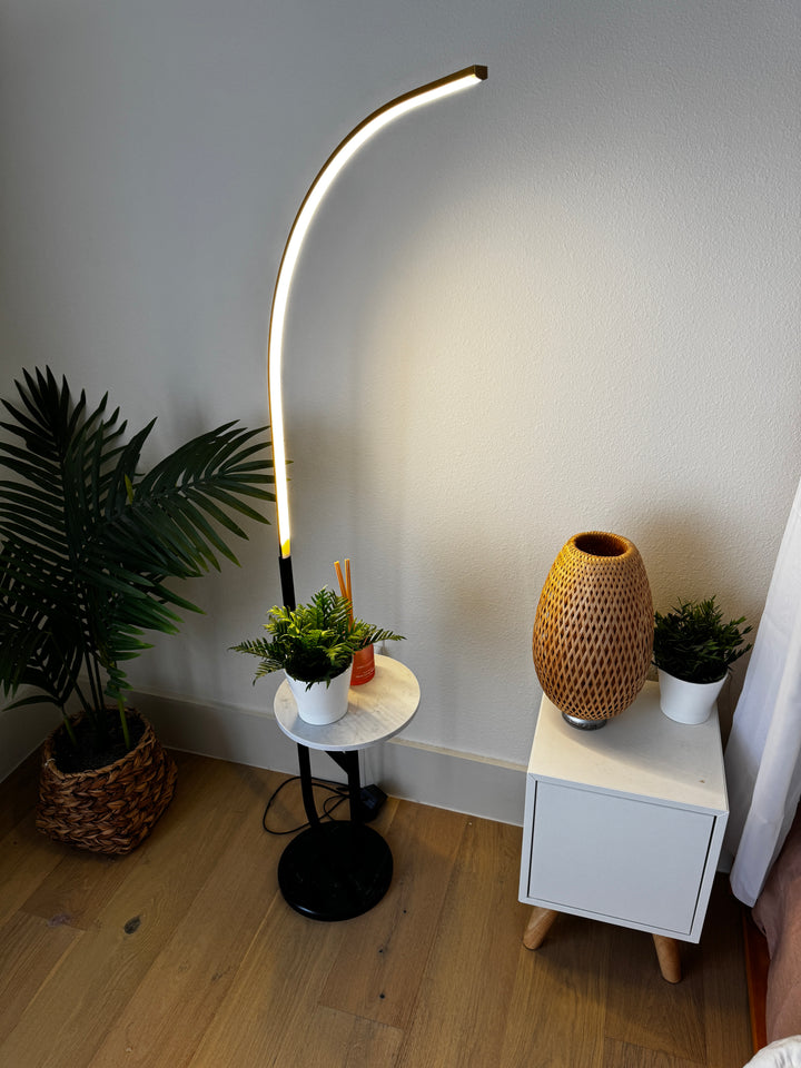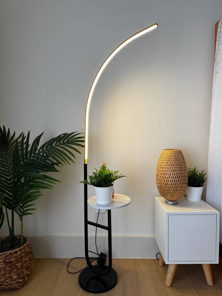 Enhance your space with the Crescenté Arc Floor Lamp, a perfect blend of style and functionality. Designed for modern living, this sleek lamp features a remote-controlled LED light with full dimming and adjustable color, ranging from warm white (3000K) to cool white (6000K). The smart memory function ensures your preferred settings are saved for effortless convenience. The built-in white marble tray adds a practical touch, ideal for holding books, remotes, or decorative accents. Paired with a sophisticated black marble base, this lamp offers both stability and elegance, seamlessly complementing contemporary interiors. Crafted for durability, the energy-efficient LED technology boasts an impressive 50,000-hour lifespan far exceeding traditional incandescent bulbs. Quick and hassle-free assembly makes setup a breeze, allowing you to enjoy premium lighting without the stress.