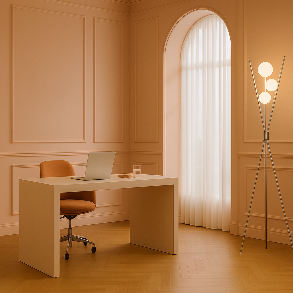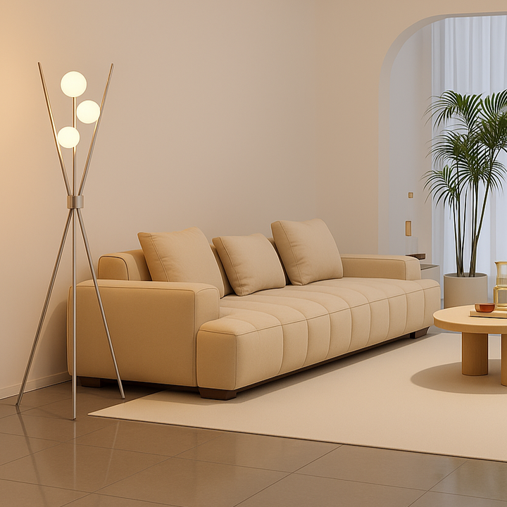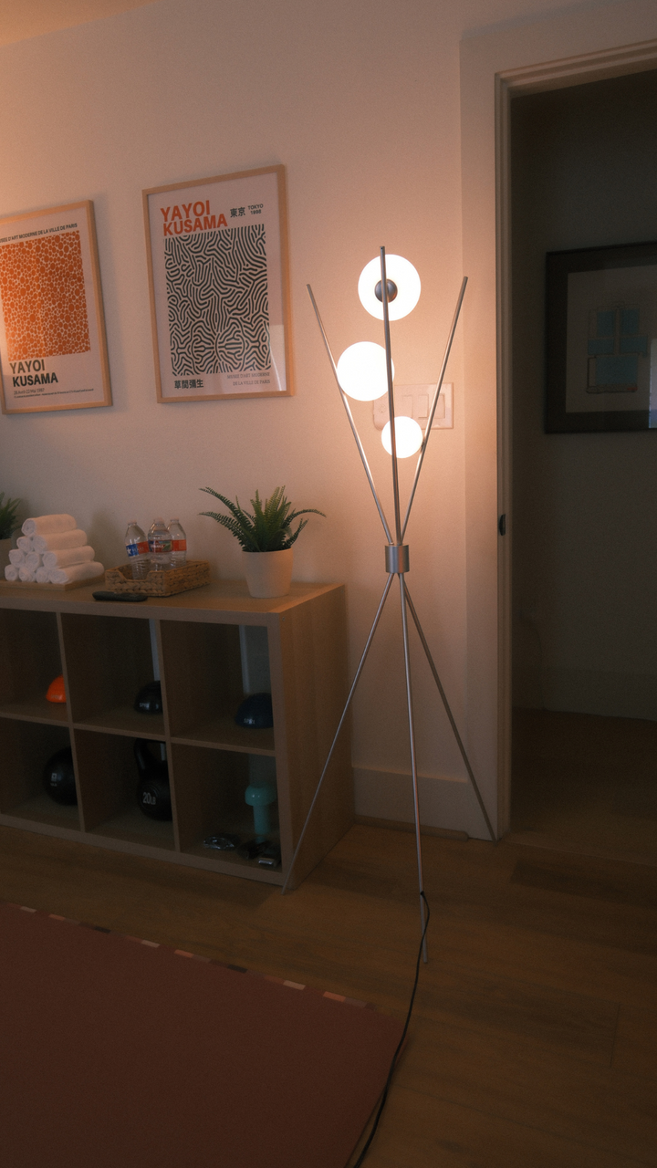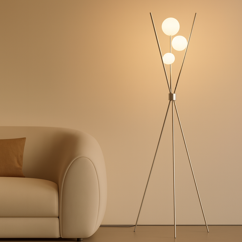 The Triglobe Floor Lamp combines modern sophistication with functional design. Its tripod base, crafted from slender matte nickel silver metal legs, ensures both stability and a sleek look. Three vertical rods extend upward, each topped with a spherical white glass globe that softly diffuses light, creating an elegant ambiance. This lamp is an excellent choice for adding refined illumination and style to contemporary living spaces.