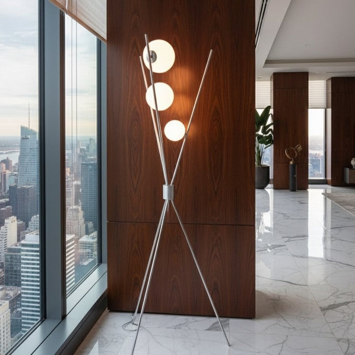 The Triglobe Floor Lamp blends modern sophistication with clean, functional design. Its tripod base, crafted from slender matte nickel silver metal legs, offers both stability and a refined look. Three vertical rods rise gracefully, each topped with milky white pearl glass shades that softly diffuse light, creating an elegant ambient glow—perfect for contemporary living spaces.
